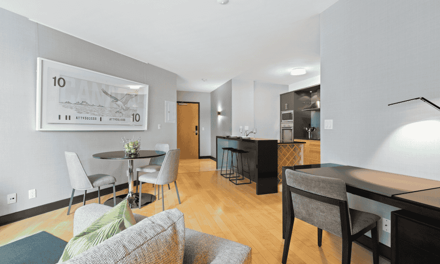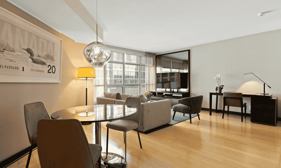 After a long day of meetings or calls, unwind in the luxurious seating area or rest in the plush king-sized bed with premium linens. The calming decor, featuring neutral tones and modern furnishings, creates an atmosphere that promotes relaxation and focus. Large windows flood the room with natural light during the day, while blackout curtains ensure a peaceful night’s sleep.