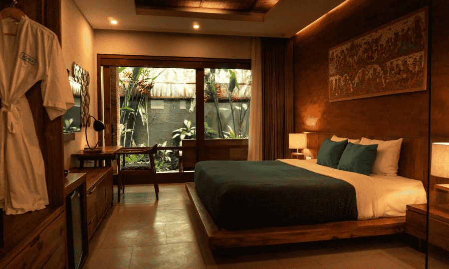 The room is thoughtfully furnished with a cozy bed adorned with premium linens, ensuring a restful sleep even during the shortest stays. A comfortable seating area is included for guests to unwind, catch up on work, or enjoy a light meal. Modern interiors, soothing color palettes, and soft lighting create a calm and inviting atmosphere, helping you recharge in style.